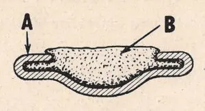 Wähle eine noch unbeschädigte Stelle (A) aus und gieße in den Hohlraum (B) geschmolzenes Blei, bis dasselbe ins Innere dringt (siehe Zeichnung). Wenn sich das Blei abgekühlt hat, so treibe dasselbe über die beschädigte Stelle und richte diese damit wieder.